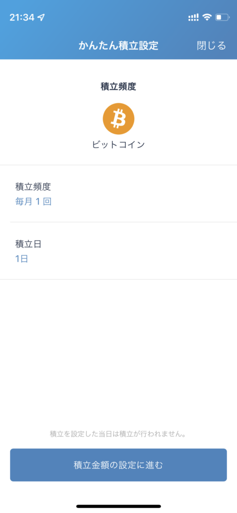 - 次に積立通貨を選択します・「ビットコイン」を選択します。