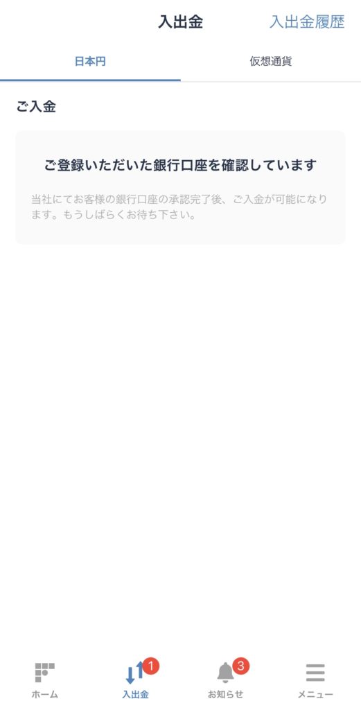 上記の写真は登録が完了した後の状態になりますが、約10分程度で審査は終了し、銀行口座の登録は完了です。