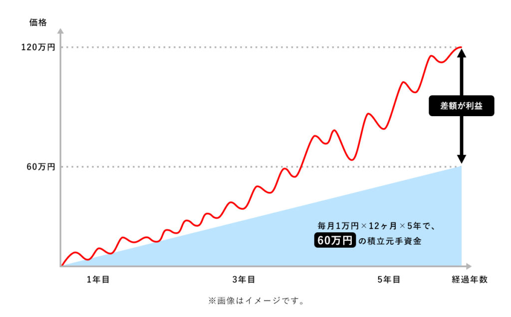 積立投資は上の画像のように長い時間を掛けて利益を出していく投資手段になります。