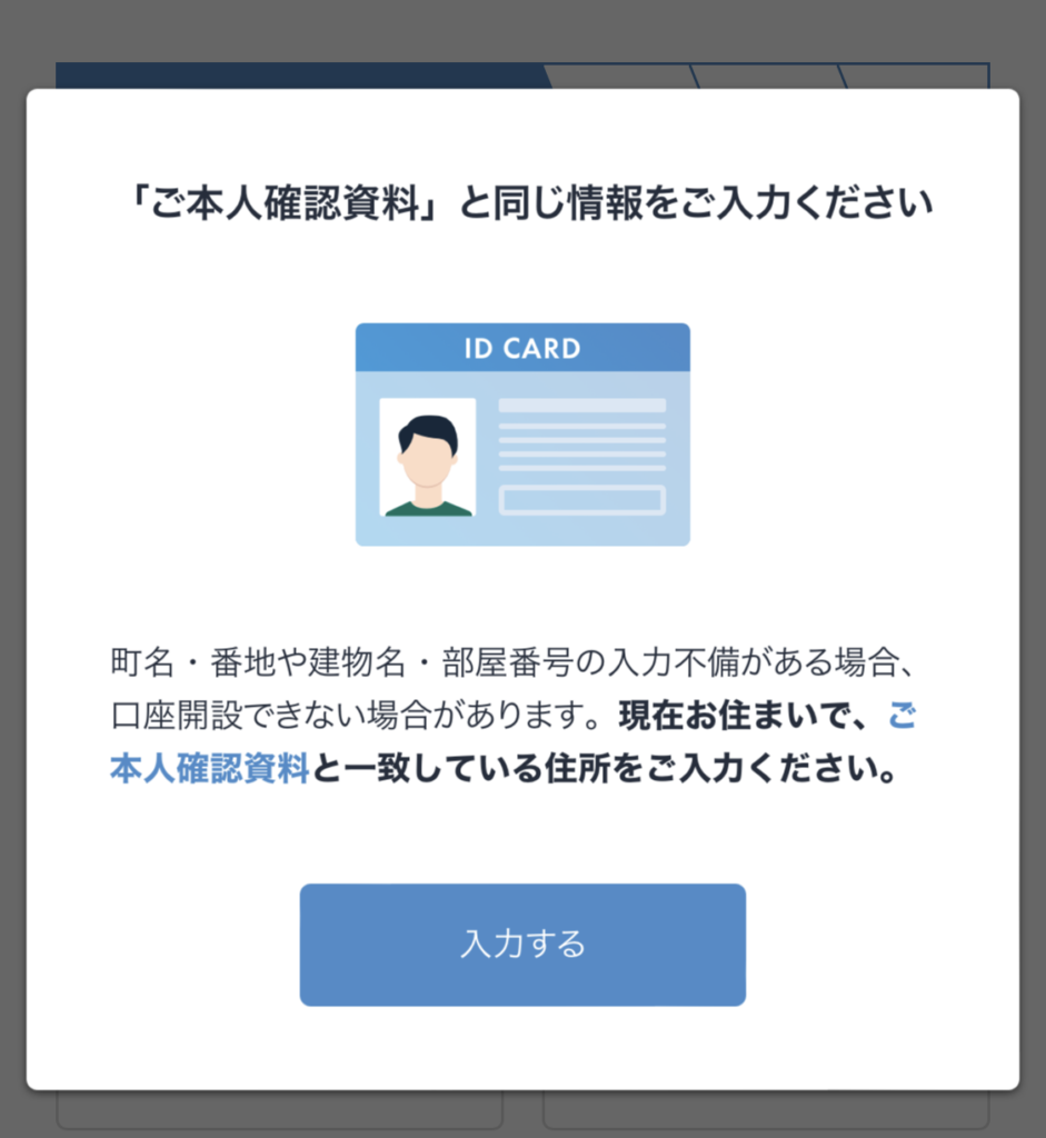こちらも特に迷うところはないと思いますが、登録する住所は本人確認書類(運転免許証、マイナンバーカード等)と同じ住所にしましょう。