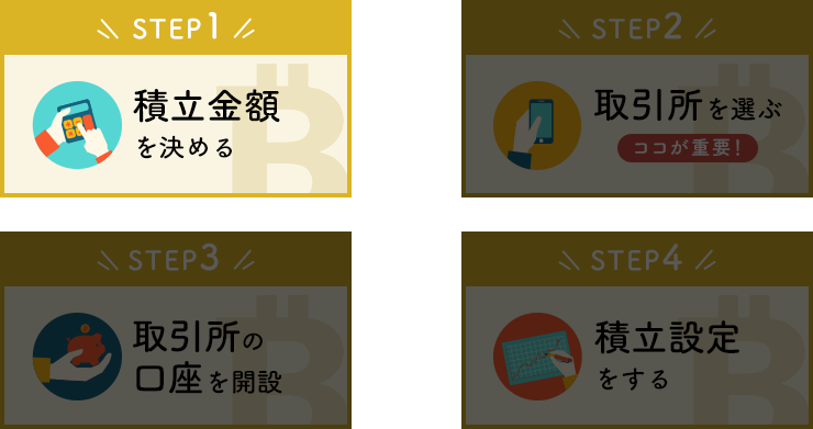 - ビットコイン積立を始めるために4つのステップに区切って解説します。