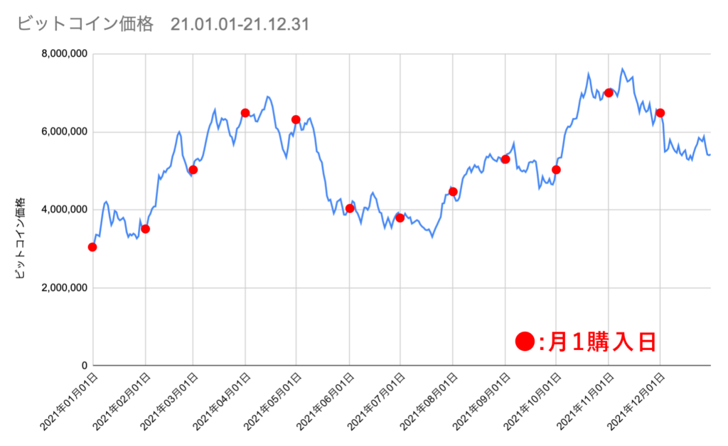 特に高騰するような相場では、安い値段で保有量が増える月1購入の方が良い結果となりそうです。