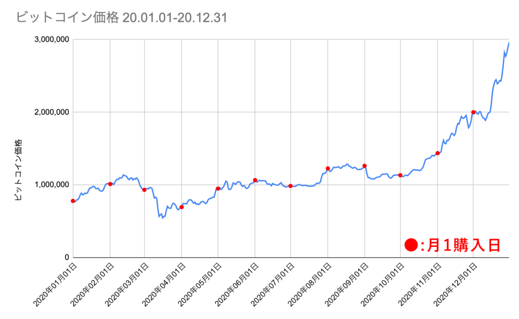 2020年の相場は年末にかけて大きく上昇するような相場でしたが、この期間では月1購入が毎日購入を上回る結果となりました。