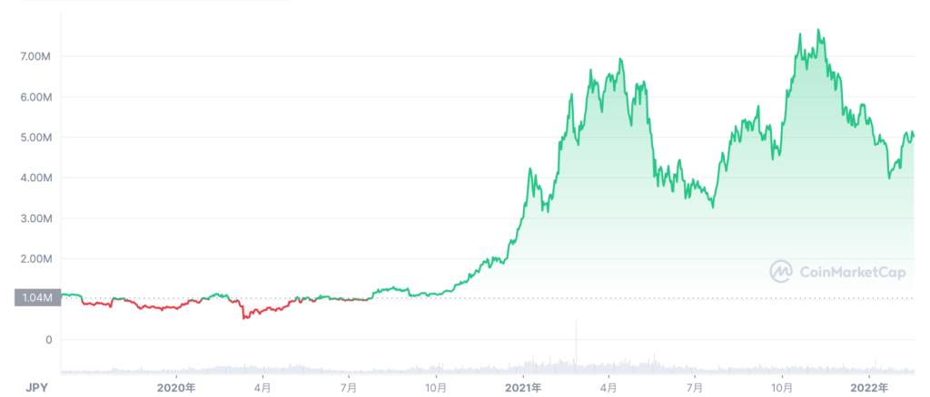 ビットコイン価格は2021年11月11日に1BTC=777万円最高値の付けましたが、その後2022年1月にかけて大きく下落傾向しました。